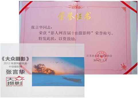 近日,我公司市場推廣部張言華榮獲江蘇省企業攝影家協會頒發的“影人網”首屆十佳攝影師稱號。張言華利用業余時間從事攝影創作,短短時間內取得了令人矚目的成績,其現為中國攝影家協會會員,中國藝術攝影學會會員,大眾攝影2012年網絡十佳攝影師,近年來有近30部作品在《大眾攝影》《中國攝影雜志》《中國攝影報》等國家級期刊獲獎發表,代表作有《北國風光》、《都不理我》、《秋》、《春花似夢》、《歲月》、《雨季》、《金色的樂章》、《冰城》、《陽光女孩》、《曾經滄海》、《廣場魅影》、《早市》、《夢里雪鄉》、《雨中漫步》、《冬眠》、《待》、《老道外》、《市場》、《夢幻荷塘》、《海邊》、《霧之韻》、《雪域晨光》、《松花江邊》、《海濱浪漫曲》等。其中《炫冰之魅》系列作品刊登在中國攝影報2014年1月14日佳作欄目。