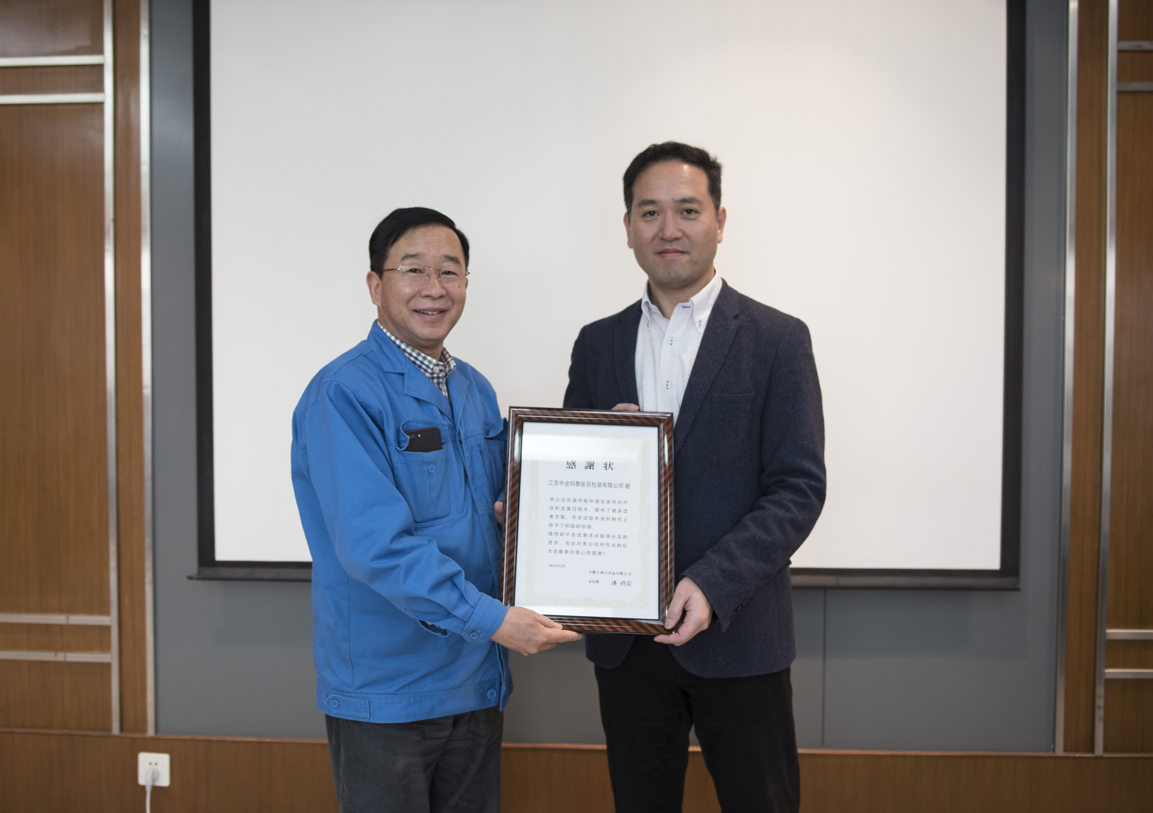交流會上,徐根華總經理對合肥小林日用品有限公司總經理湊修司一行的到來表示熱烈的歡迎,并希望雙方在今后的合作中能進一步深化溝通交流,構筑互動平臺,不斷開創合作共贏、共同發展的新局面。湊修司總經理代表合肥小林日用品有限公司向中金瑪泰頒發了優秀供應商獎杯及感謝狀,對中金瑪泰提供的優良產品及完善的售后服務表示衷心的感謝!